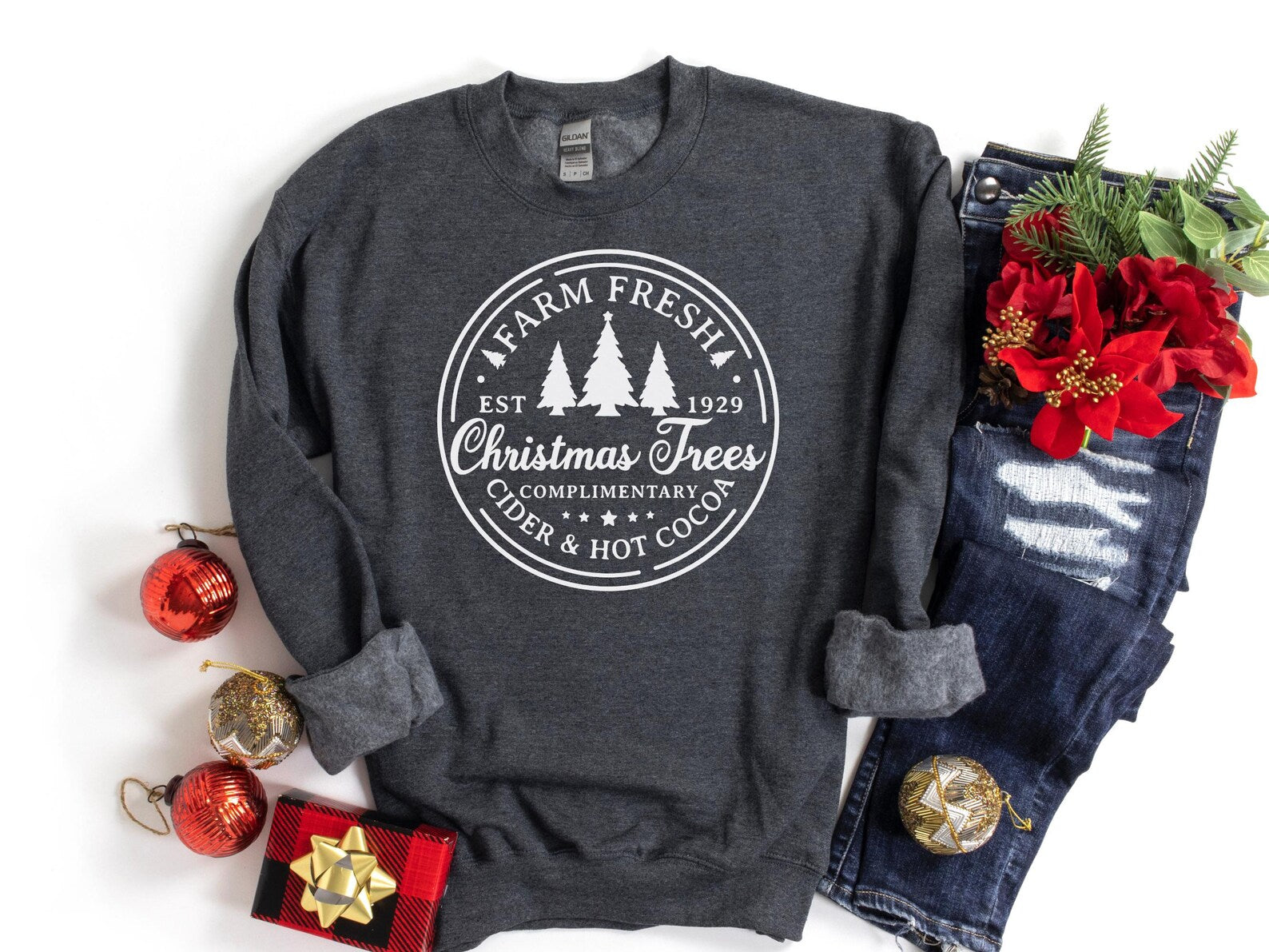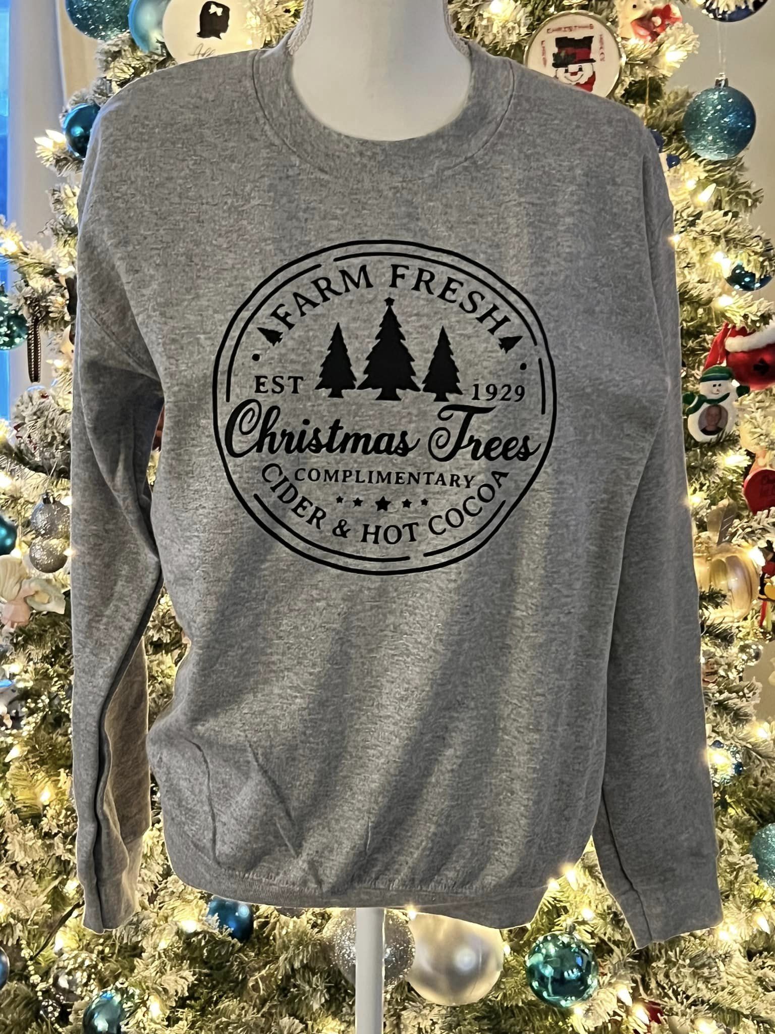 Farm Fresh Christmas Trees Crewneck Sweatshirt also says, "complimentary cider and hot cocoa." It will soon become your favorite sweatshirt to wear this holiday season!